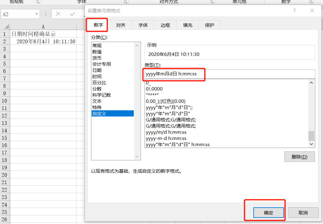 如果日期时间显示到年、月、日、时、分、秒,只需要在自定义格式类型框中输入: