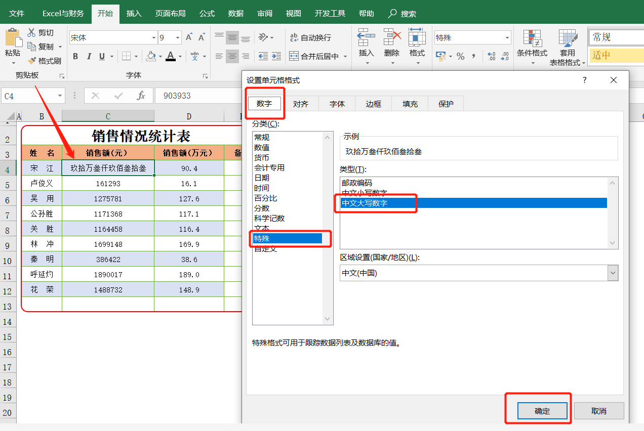 选择【数字】页面,分类选择【特殊】,类型选择【中文大写数字】