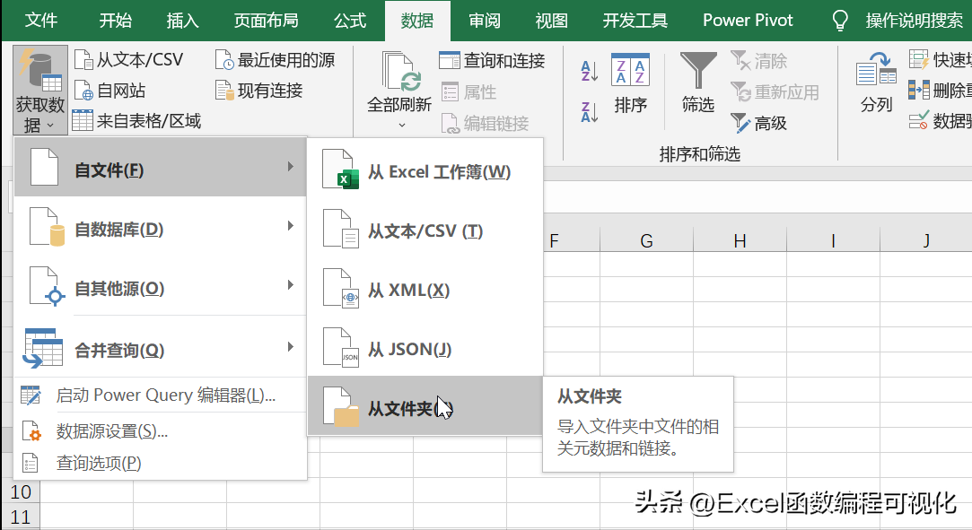 接着新建一个工作簿,依次点击【数据】—【获取数据】—【自文件】—【从文件夹】,选中上一步准备好的文件夹,点击确定。