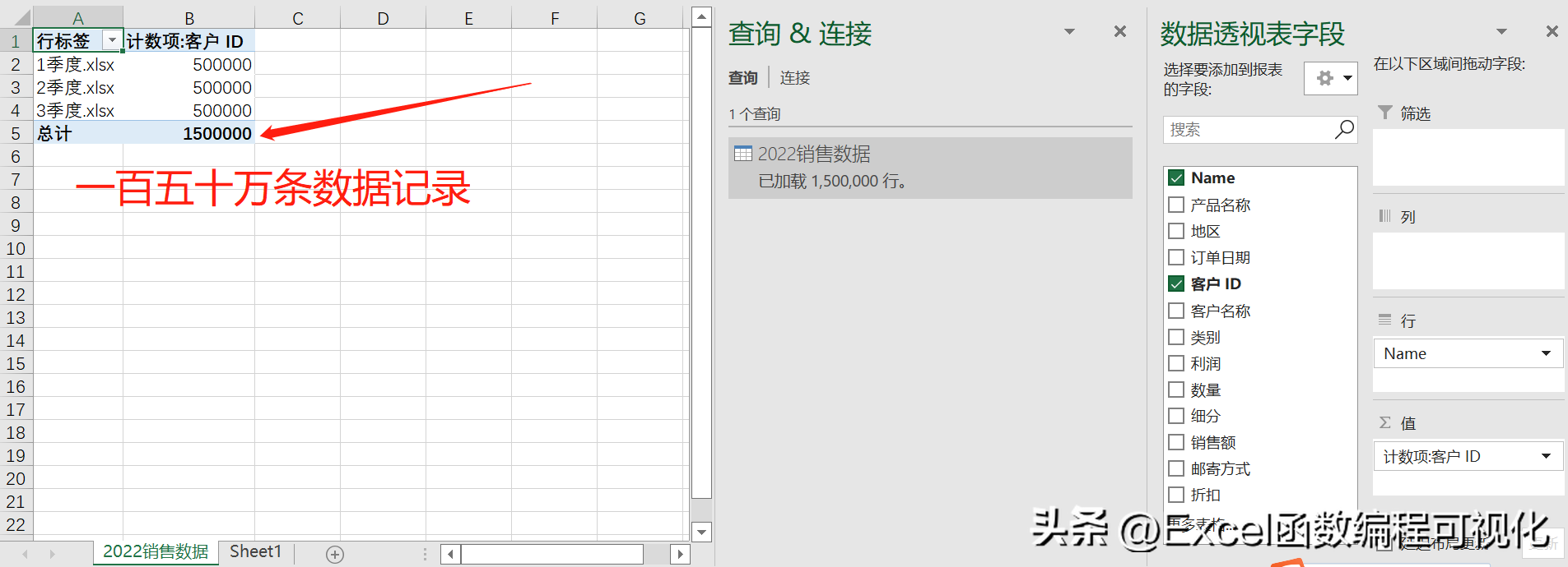 由于Excel最大仅支持1048576行,所以我们无法将所有数据全部加载到Excel中去,这里采用数据透视表的方法。