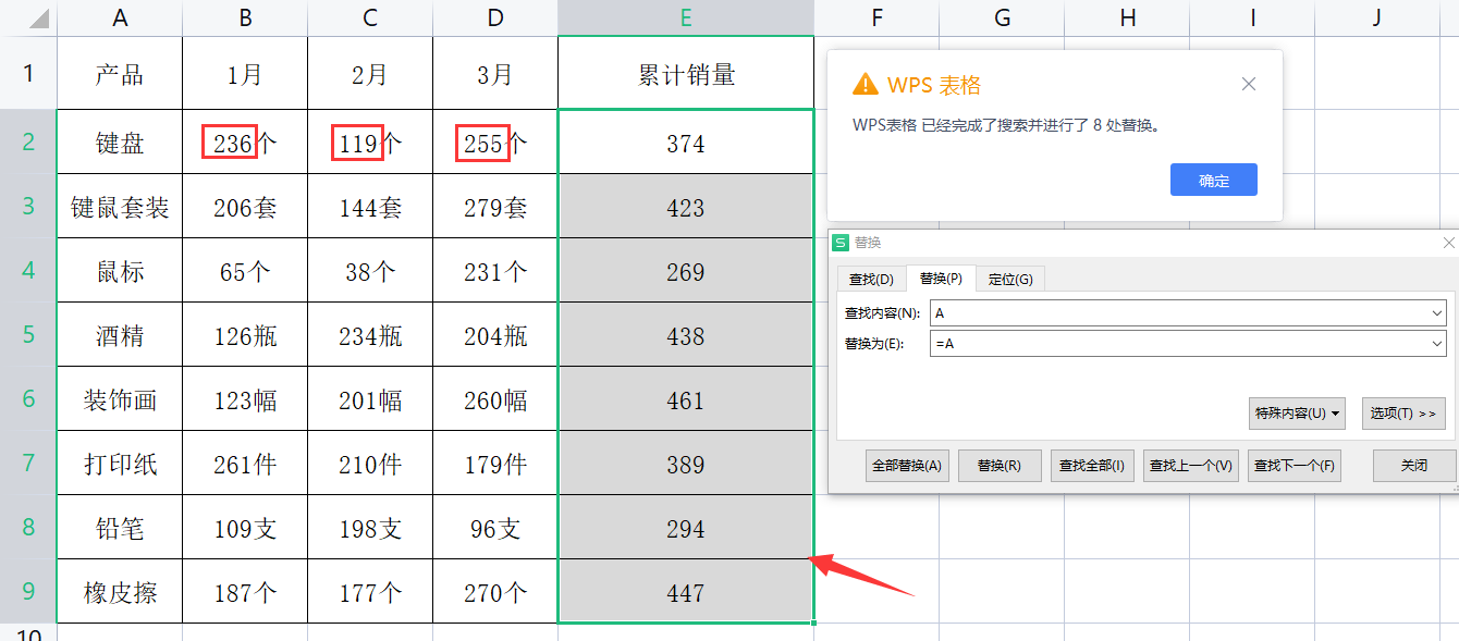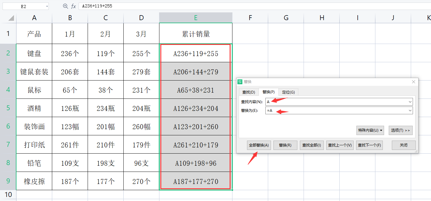 メ我们选择E列——按下CTRL+H(替换)——查找内容输入“A”,替换为输入“=A”,点击全部替换。メ