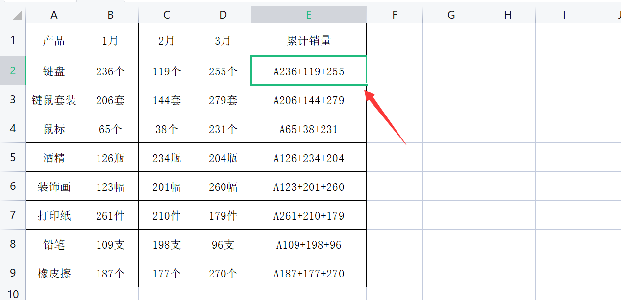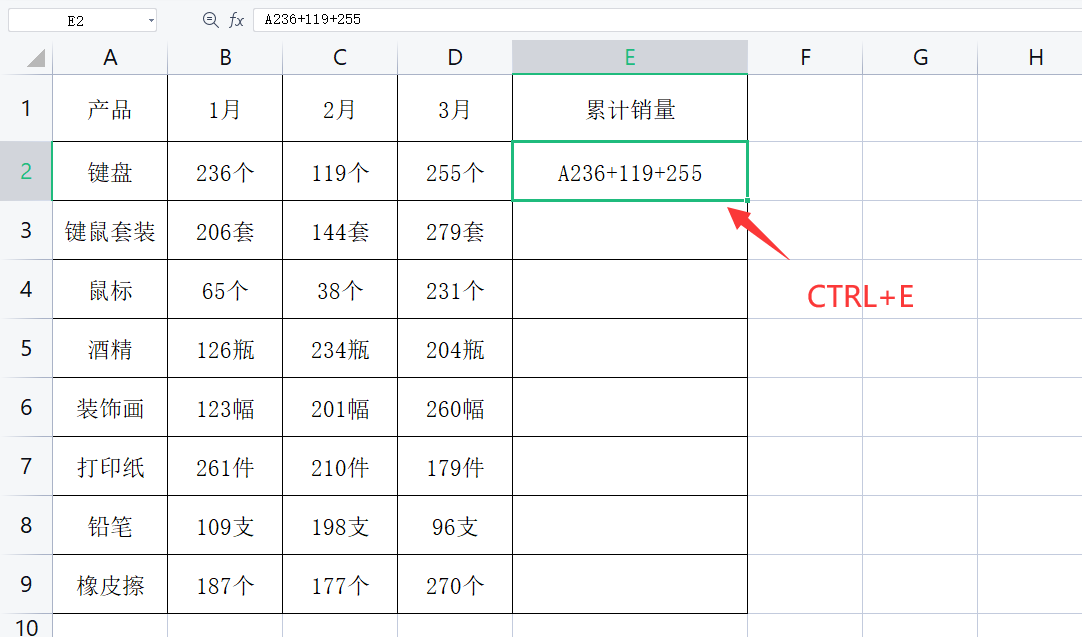 メ这里我们在E2单元格输入A236+119+255,输入完成以后按下CTRL+E(批量填充)。メ