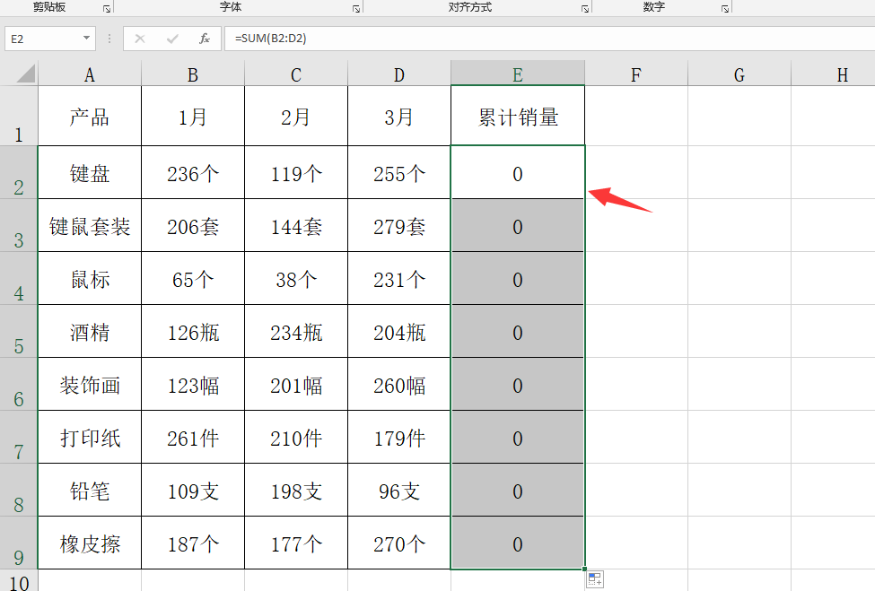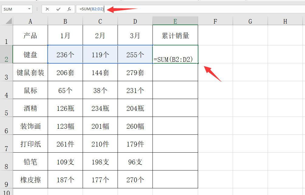 メ我们直接输入公式=Sum(B2:D2)。メ