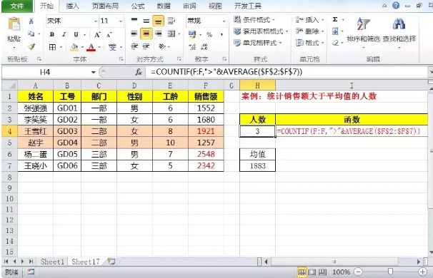函数公式:=COUNTIF(F:F,">"&AVERAGE($F$2:$F$7))