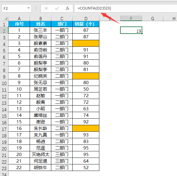 以上是COUNTA函数介绍以及注意事项,下面我们来看一个非常简单的案例,计算出单人数,下面的表格中,当该员工出单的时候,就会被记录上销量,而未出单人员则不做任何记录,我们要求出单人数,是不是只需要对销量这一列进行非空单元格计数即可: