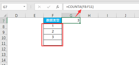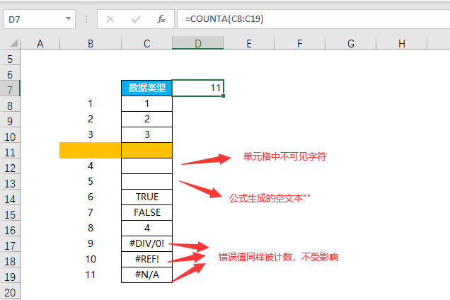 我们可以看到,计算得出红框中的非空单元格个数为3,因为F11单元格为空,所以未被计数。那我们来看一下这个函数的注意事项:COUNTA 函数计算包含任何类型的信息包括:空格(回车等非打印字符)、错误值、公式生成的空文本等。我们来解释一下: