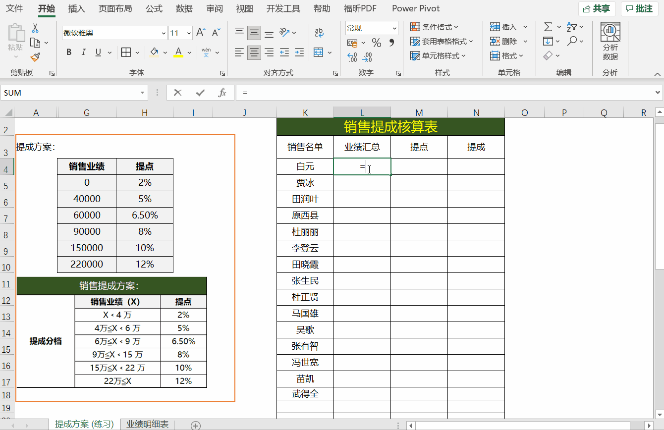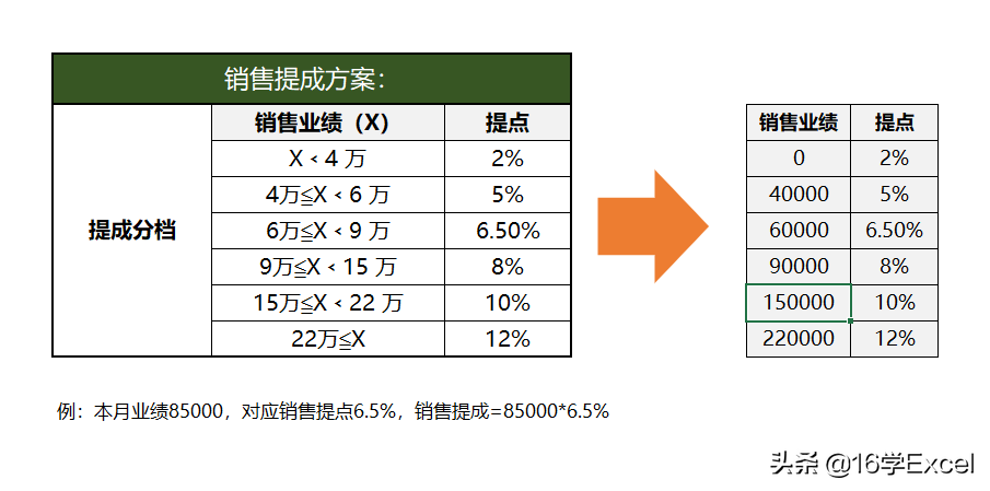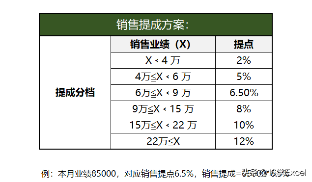 步骤一、分析提成方案(业绩区间不同提成点不同)