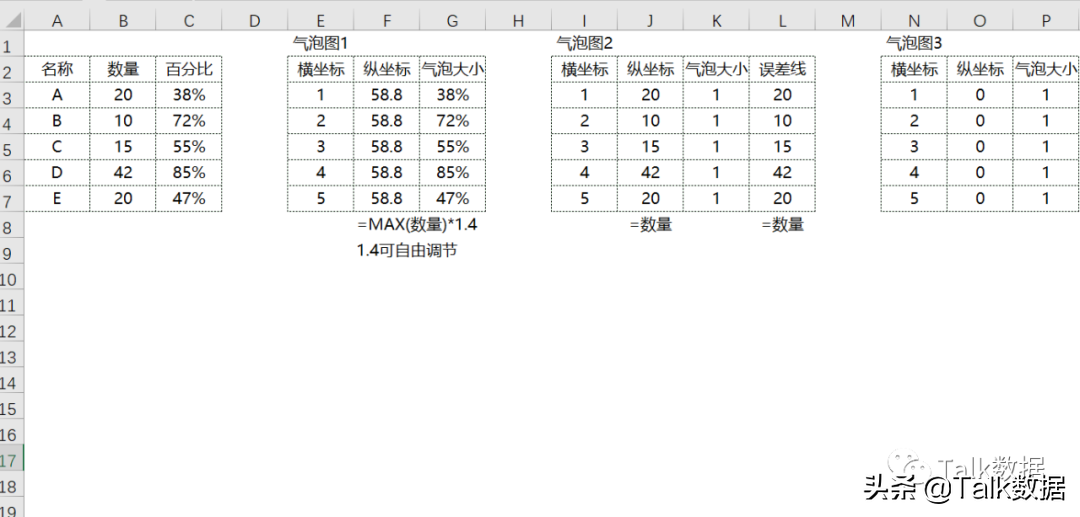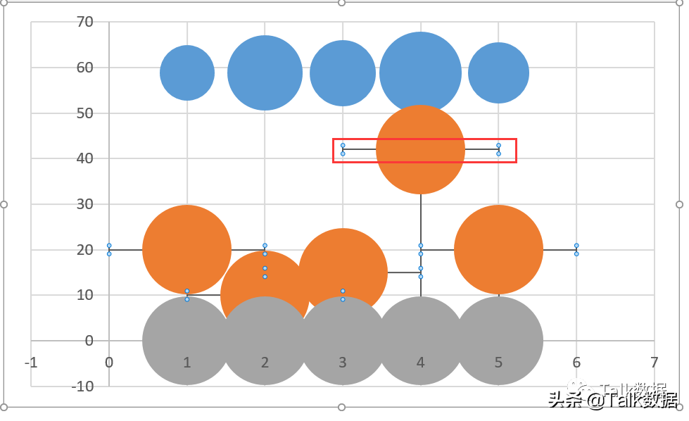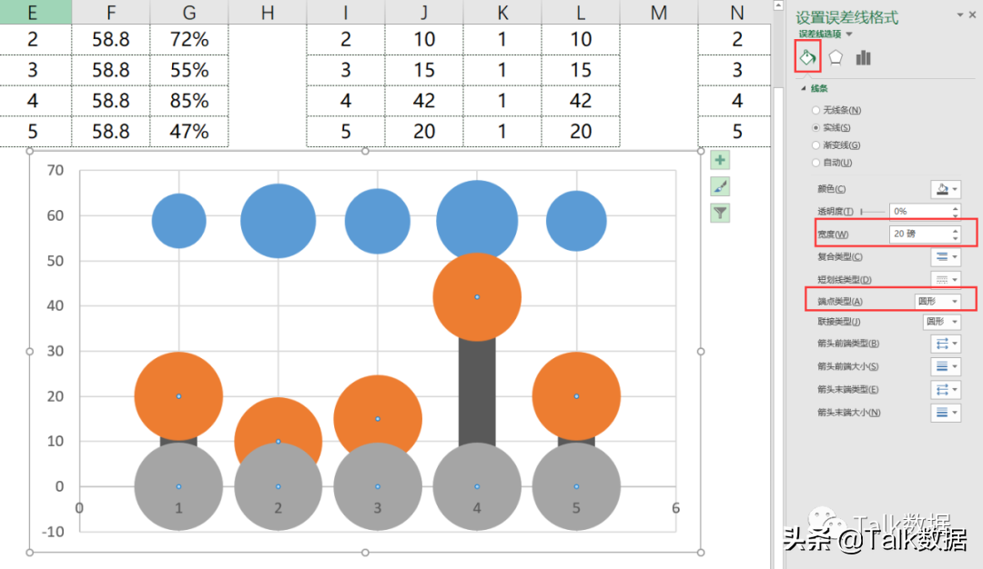 效果图中包含了三个气泡图以及一个误差线,利用误差线作为柱状图,利用气泡图添加横坐标和柱状图数据标签。图表的制作方式将用图片的方式分步骤展现出来。