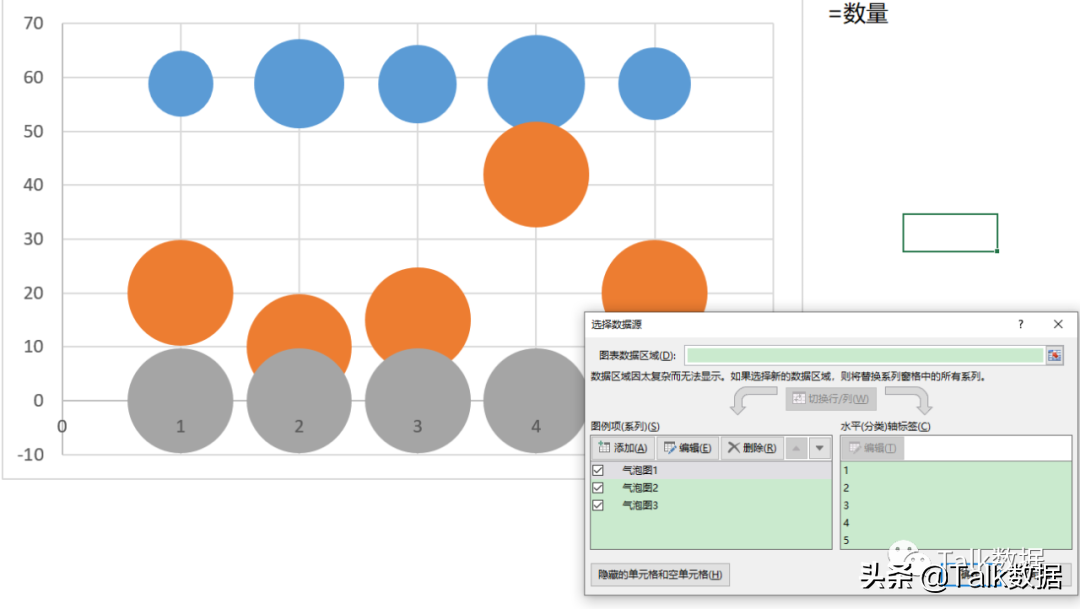 第五步:为气泡图2、气泡图3添加数据标签,数据标签为单元格中的值,并将颜色填充改为无填充。