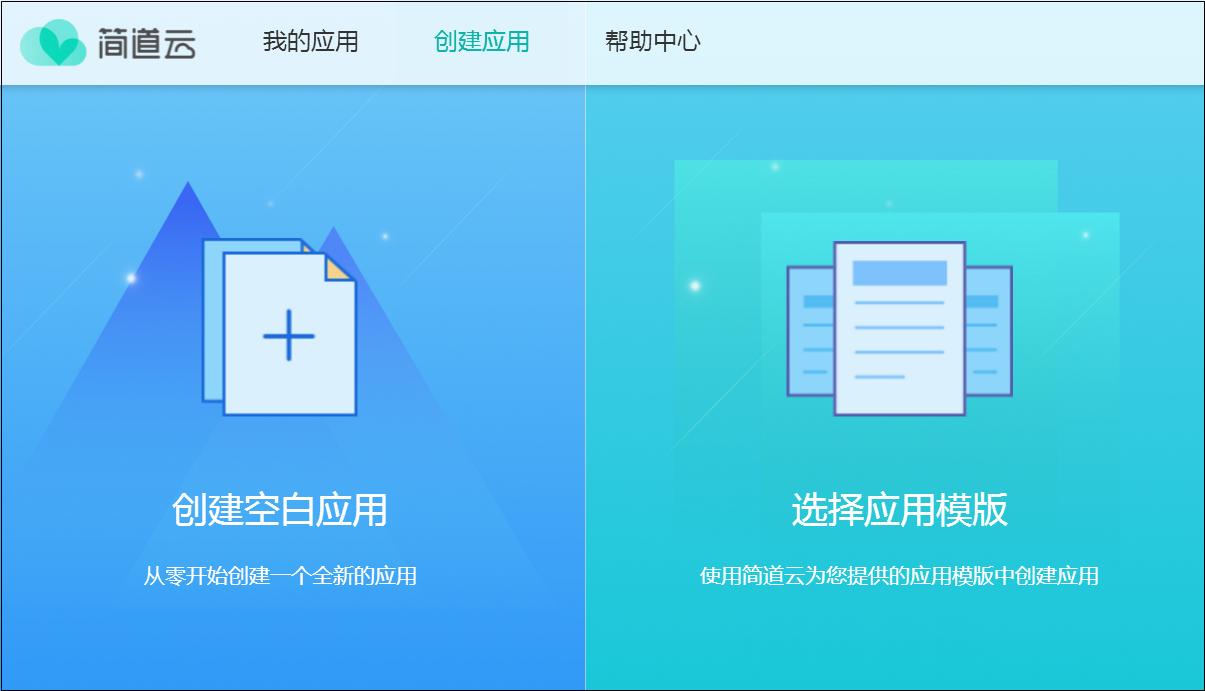 简道云的用户界面与软件名称确实呼应:简单、云端,整个界面基本是蓝绿白三色系。软件使用起来也是一款自由度比较高的产品。