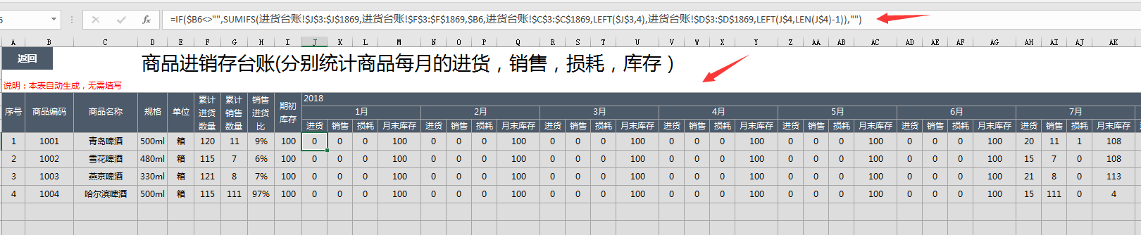 进货台账在进货中填写日期,编码,数量,供应商名称,带颜色部分自动生成。