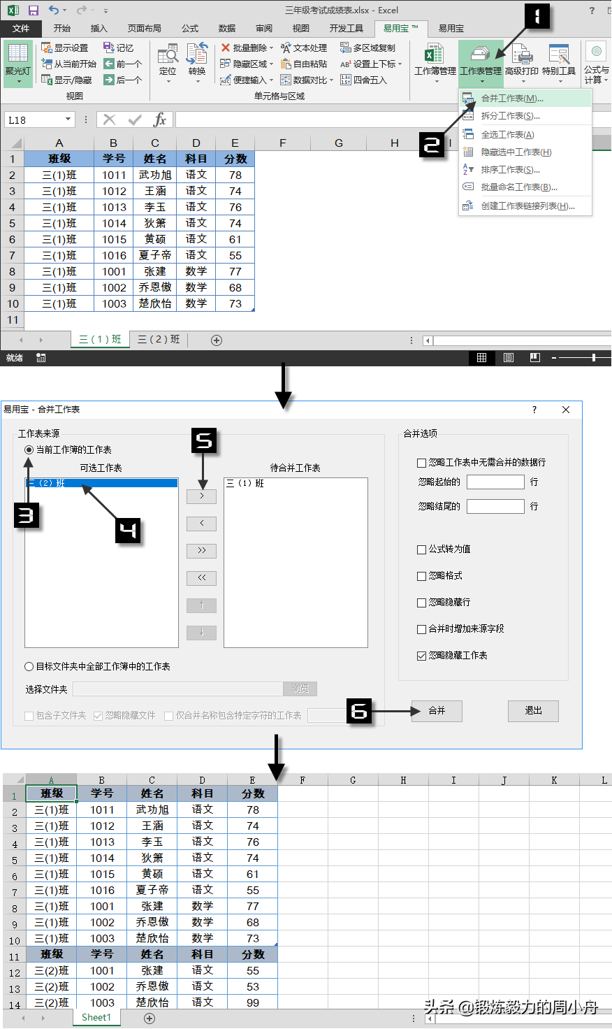 再比如,工作表合并也是日常工作中常见的需要,但如果自己不懂得编程的话,这一定是一项“不可能完成”的任务。Excel易用宝可以让这项工作显得轻而易举,它能批量合并某个文件夹中任意多个文件中的数据,如下图所示。