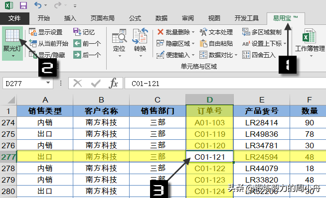 比如,在浏览超出屏幕范围的大数据表时,如何准确无误地查看对应的行表头和列表头,一直是许多Excel用户烦恼的事情。这时候,只要单击一下Excel易用宝“聚光灯”按钮,就可以用自己喜欢的颜色高亮显示选中单元格/区域所在的行和列,效果如下图所示。