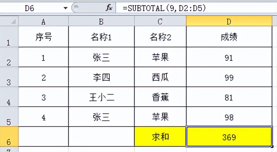 对单元格D2:D5进行求和操作,369。