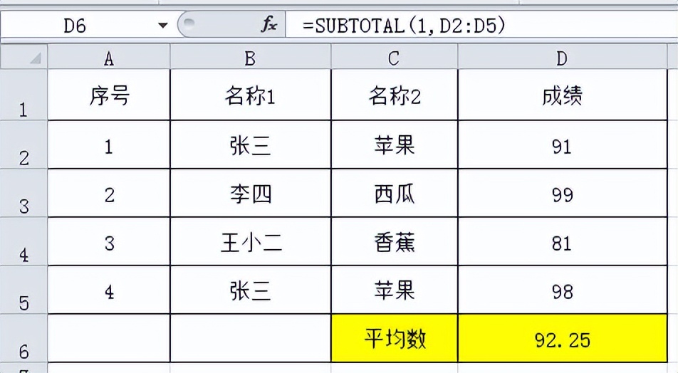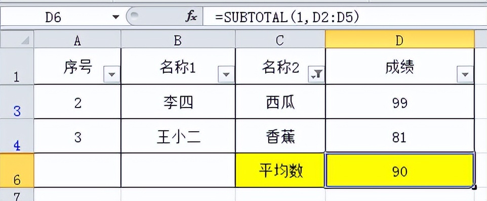 我们筛选后可见单元格只剩下西瓜和香蕉,这个时候平均值求出来的只是西瓜和香蕉的平均数。