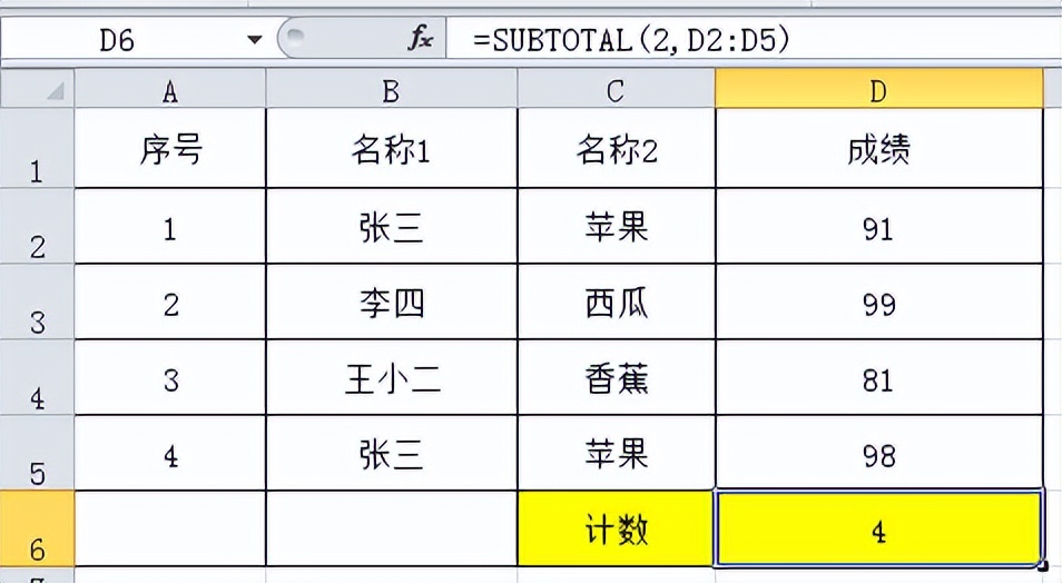 我们都知道COUNT函数为计数函数,同样的道理,对D2:D5区域内可视且有数据的单元格进行计数。