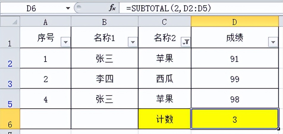 筛选后,可视单元格计数为3