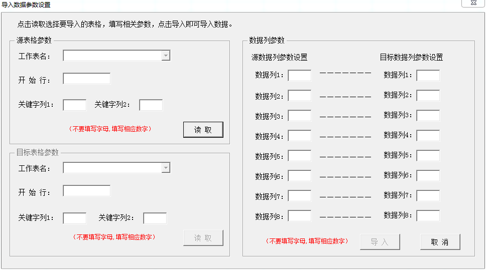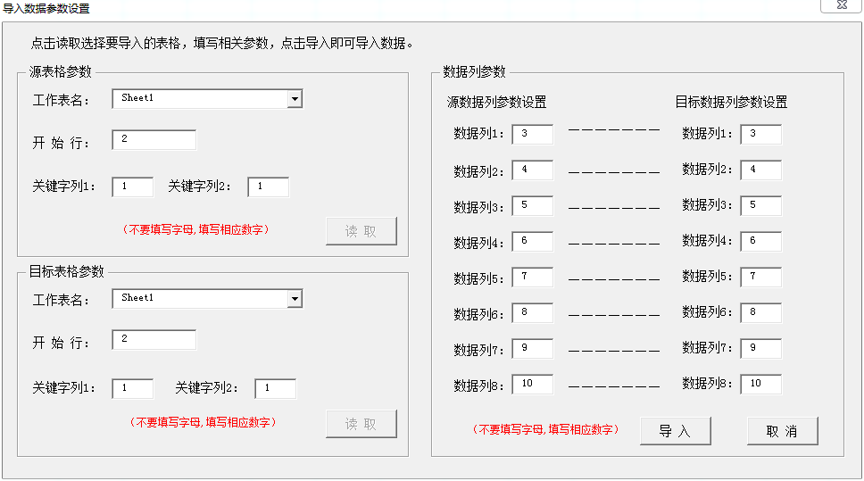 3.设置目标表格相关参数。点击目标表格参数中的读取,选择目标表格文件,打开目标表格文件后,根据表格数据设置相关参数。如下图:
