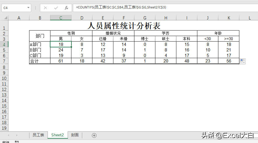 我最终的目的是要完成上图这样的员工信息分析,不知道小伙伴们能不能根据前面学到的东西完成上图这样的信息分析表呢?