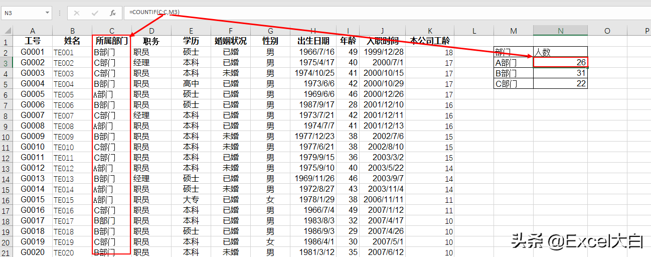 公式中的 C:C 表示部门所在的区域,M3 表示引用M3单元格的值“A部门”,这样写公式我们可以很方便的拖动单元格进行填充。