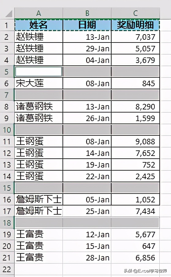 今天教大家制作奖金条,是工资条的升级版:工资条中每个员工的记录只有一条,而在奖金条中,员工根据绩效可能有多条记录,每个人的记录数各不相同。