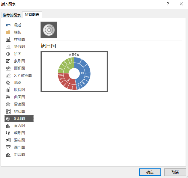 2.选择所有图标中的旭日图,旭日图以圆圈中的同心环表示分层数据,数据值被编码为每个环弧