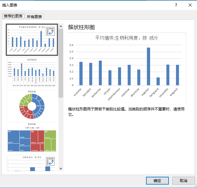 1.打开Excel 2019,输入数据,分别为中药名>成分>生物利用度,然后我们选中数据,插入>推荐的图表,点击推荐的图表