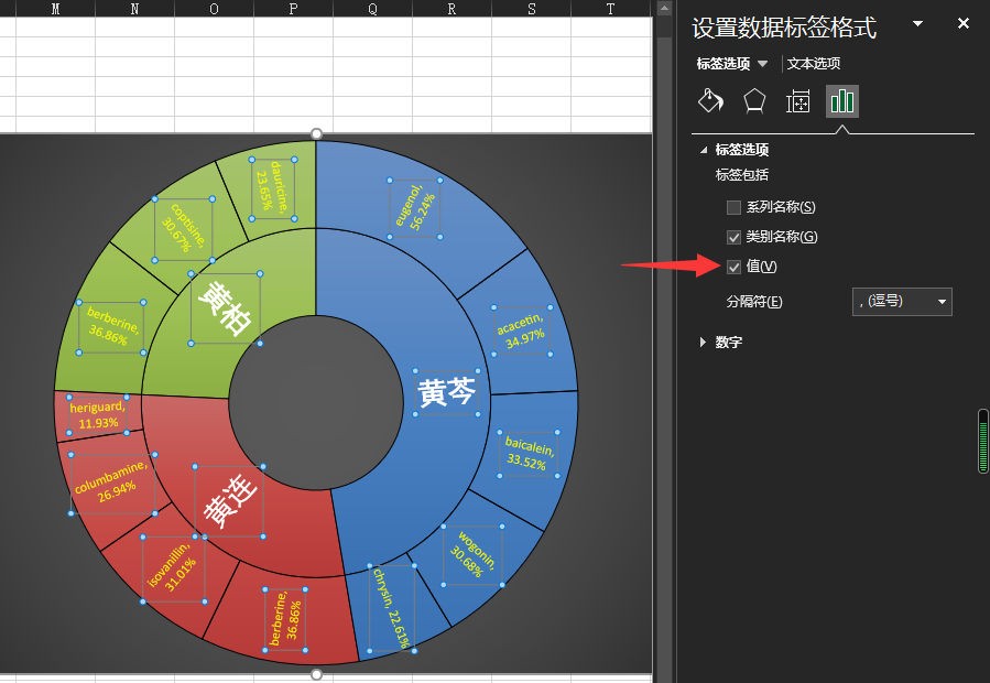 7.右击标签,选择设置数据标签格式,显示数值,数值就会显示出来了