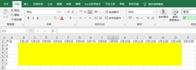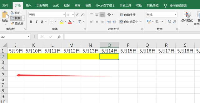 然后我们希望第2行的颜色随着时间自动的变化,比如今天是5月14日,所以小于今天的部分全部标记成黄色,今天之后的部分全部标记成绿色