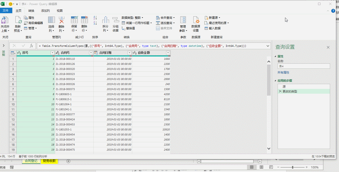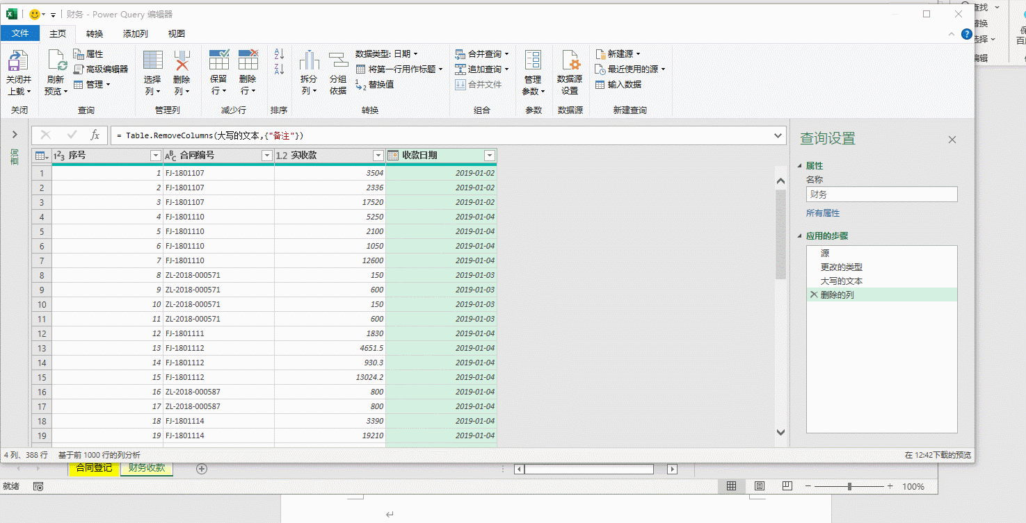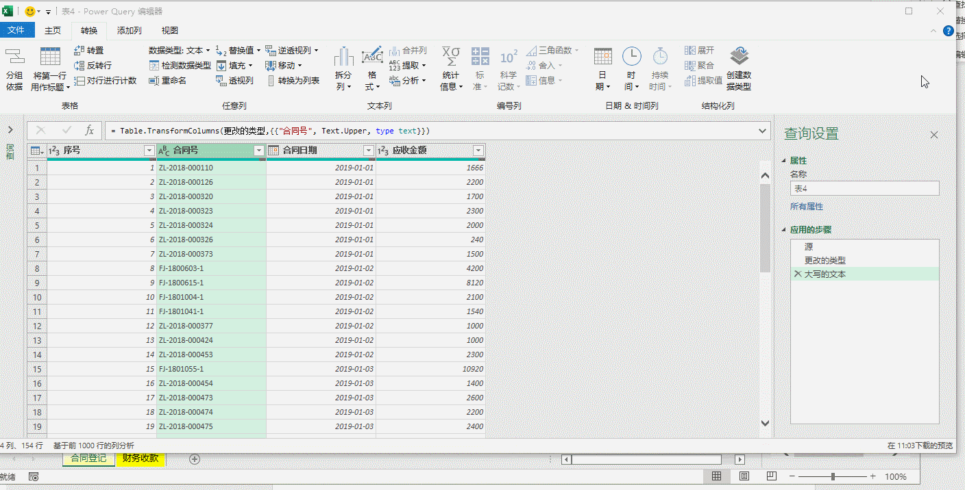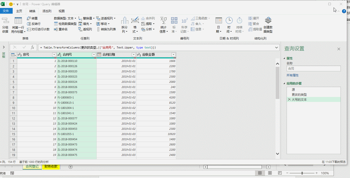 同时,像上面操作一样先将“收款日期”修改为日期格式,然后将“合同号”列中字母转化为大写,选定“合同号”,点击“转换”-> “格式”->“大写”,如果“备注”没用就删除了,将查询“表1”修改为“财务”。动图六。
