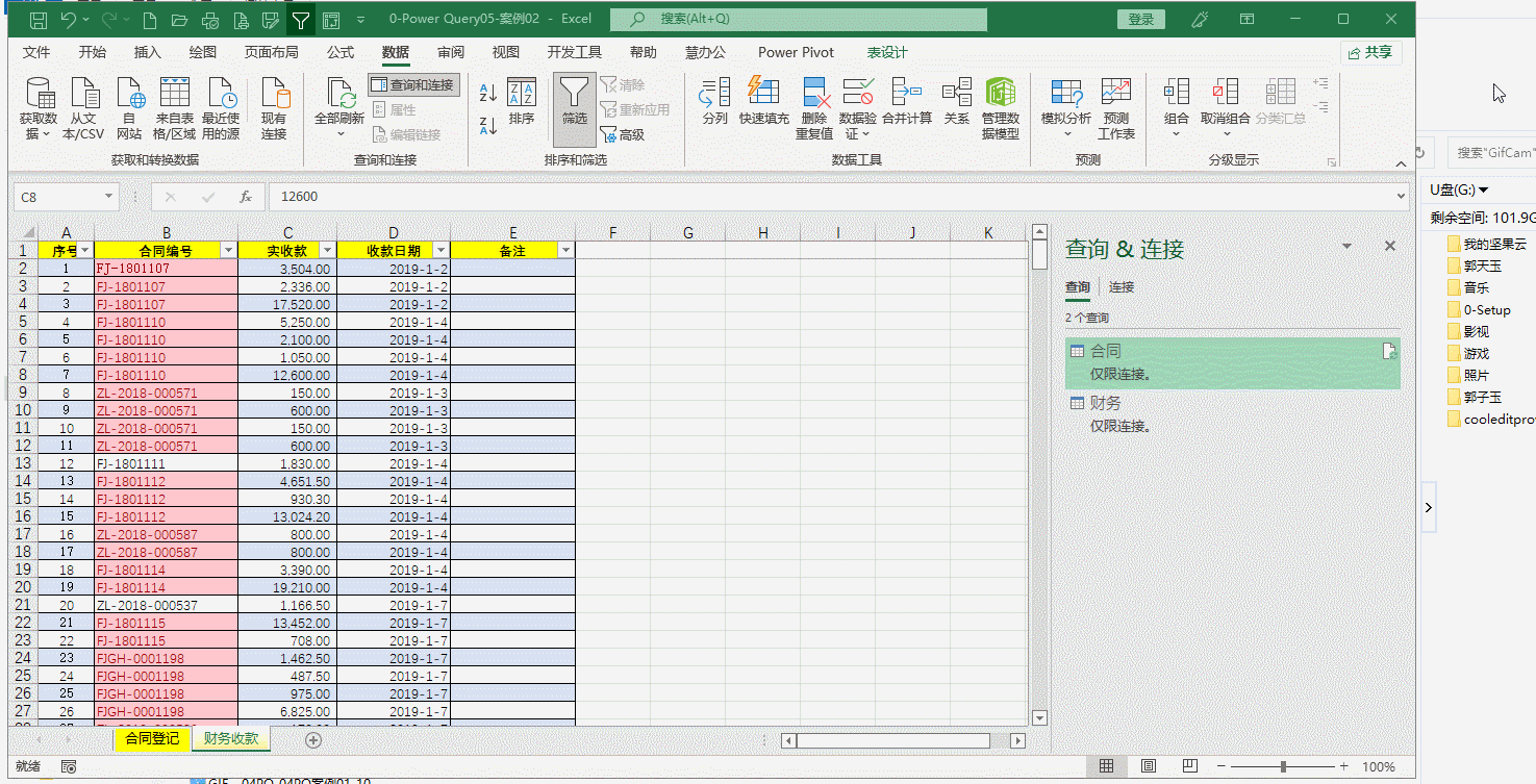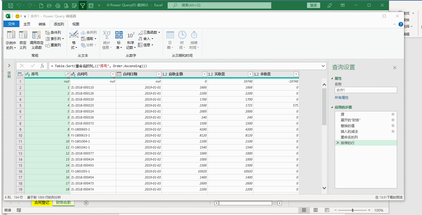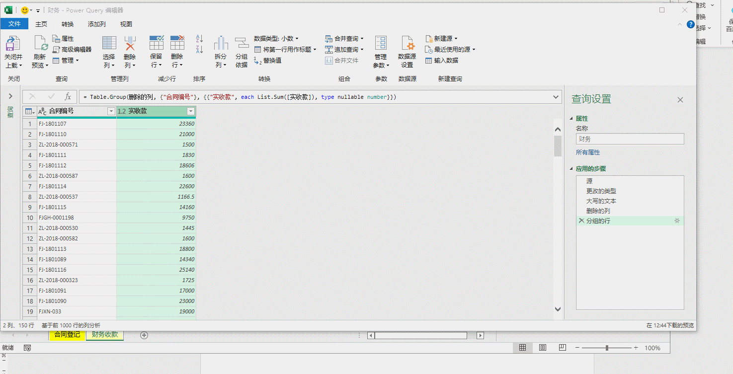 同时,像上面操作一样先将“收款日期”修改为日期格式,然后将“合同号”列中字母转化为大写,选定“合同号”,点击“转换”-> “格式”->“大写”,如果“备注”没用就删除了,将查询“表1”修改为“财务”。动图六。