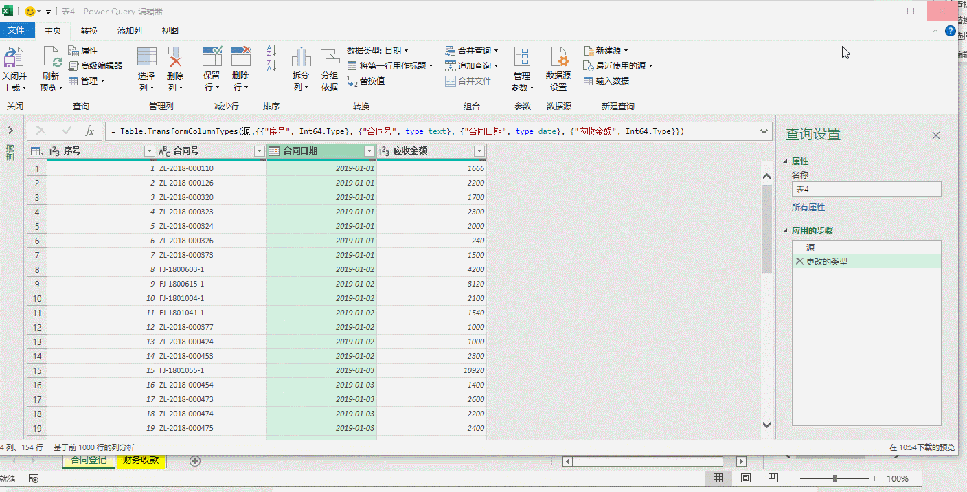 我们来注意看,右侧的查询步骤窗口,目前有两个步骤,一个是“源”,一个是“更改的类型”,把“合同登记”表导入到PQ后系统根据列的情况自动识别的类型,“合同日期”被识别为“日期/时间”类型,我们修改为“日期”类型,替换当前转换即可。动图二。