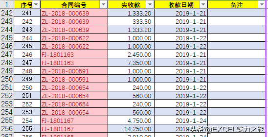 基础表二为“财务收款”表,有“序号”、“合同编号”、“收款日期”、“实收款”、“备注”五列,这张表一般来说是从财务系统的“主营业务收入”贷方提取整理的数据表,格式如下。截图二。