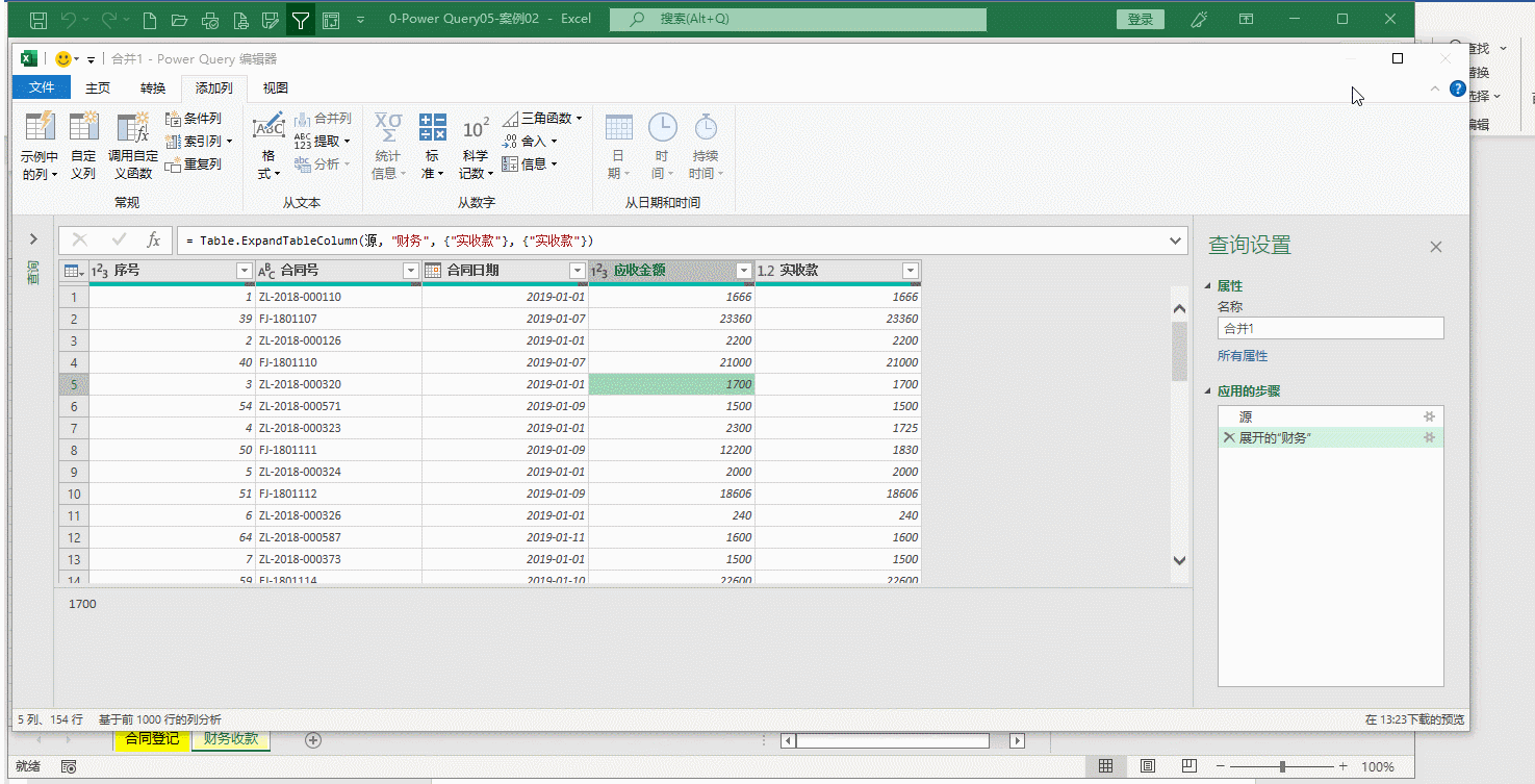 操作过程其实就是将这两张表横向合并,首先,我们选择“合同”,然后右键选择“合并”,对话框这里,因为你选择的是“合同”,所以这个查询已经有了,合并的第二个查询需要你选择,我们选择“财务”这个查询,选择后要注意,这里要选择合并的依据,这里就是“合同号”;“联接种类”这个选项非常重要,PQ提供了六种选项,这里我们选择“完全外部”,选择后我们会进入查询编辑器的操作界面了,我们点击“财务”标题后面的符号,这是展开或聚合的功能,默认是展开不用管,下面的选项一般我们将“使用原始列名作为前缀”勾选去除,根据需要选择“财务”中的列,第一次选择了“合同编号”,选错了,这里正好可以演示一下,在PQ里出现操作错误也可以通过步骤中的小齿轮进行修改。我们将实收款展开。动图九。