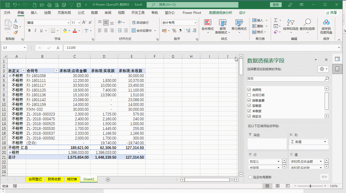 不仅如此,这个演示表是1月的,如果将2月的合同登记和财务收款继续放置到对应的原始表里,只需要刷新后面的核对表和数据透视表,结果就自动更新了。有兴趣的可以自行添加数据进行演示。