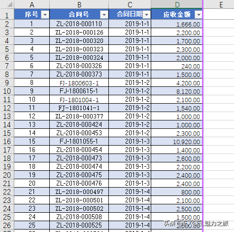 基础表一为“合同登记”表,有“序号”、“合同号”、“合同日期”、“应收金额”四列,实际工作中这个表可能还有更多列,演示就简化了,格式如下。截图一。