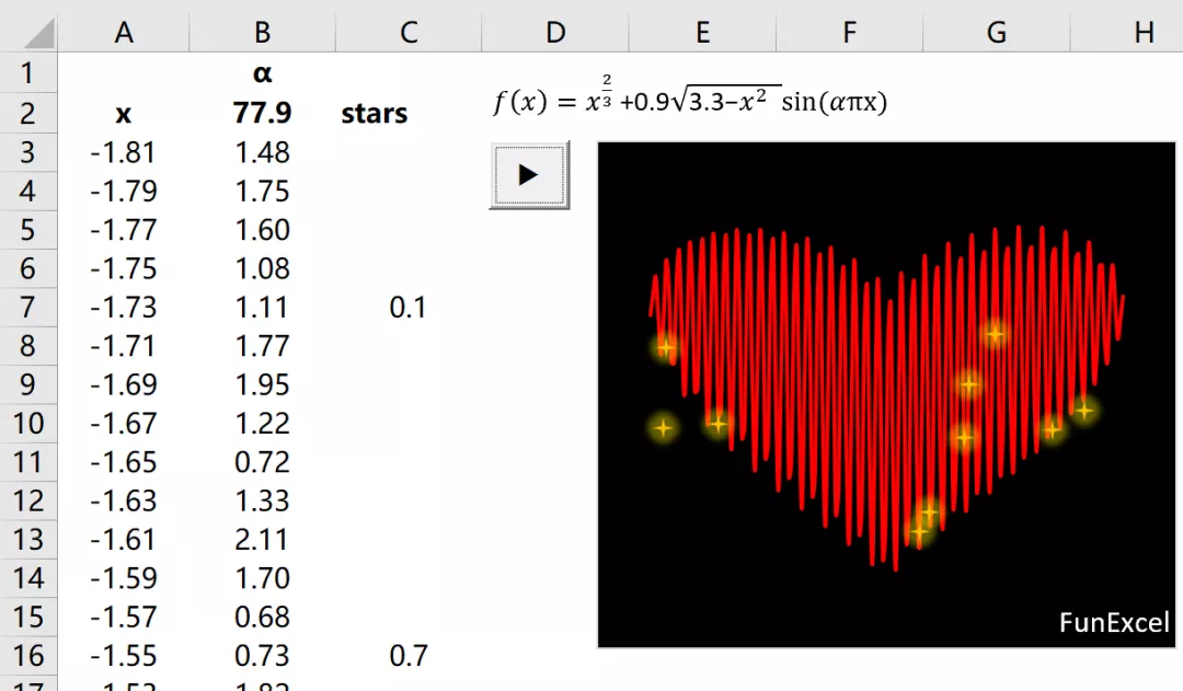 C1单元格里是α的值,不断改变这个值,会产生变化的心形图。