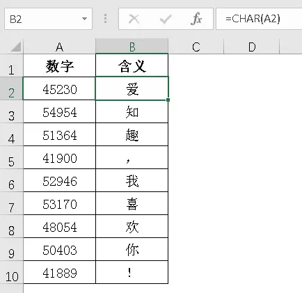 输入公式:=CHAR(A2)
