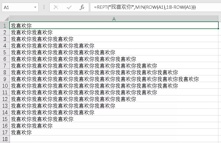 输入公式:=REPT("我喜欢你",MIN(ROW(A1),18-ROW(A1)))