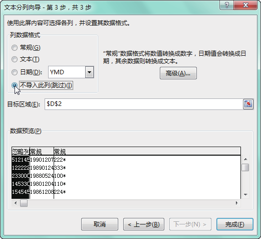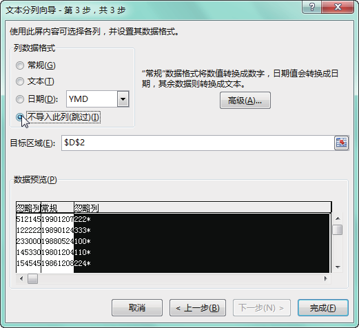 第 3 步 在"文本分列向导 - 第 3 步,共 3 步"对话框中的"数据预览"区域选中第一列,选中 "不导入此列(跳过)"单选按钮,如下图所示。