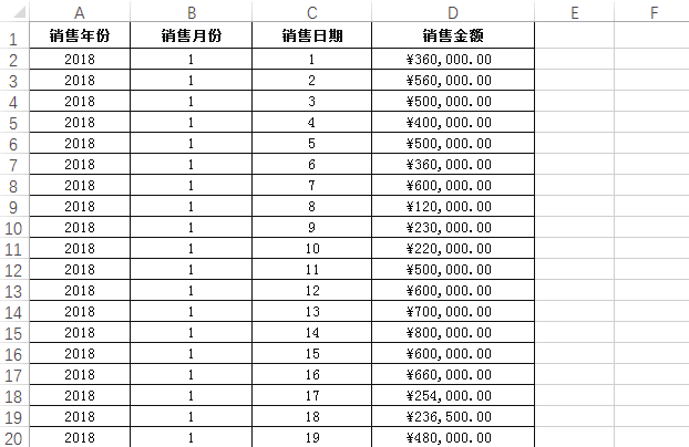 如下图所示,E列是8位数值的日期数据,分别表示四位年份、两位月份和两位天数。