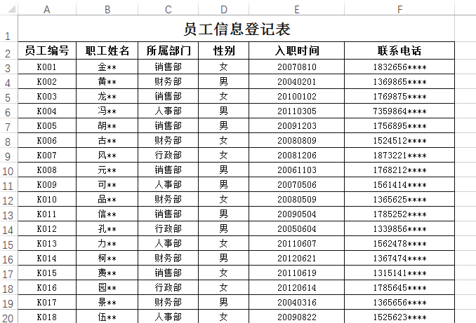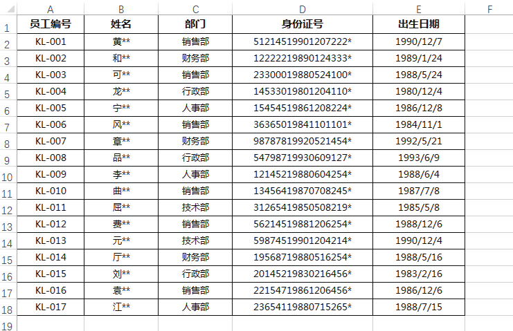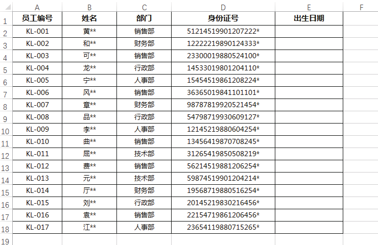 第 6 步 即可看到选定区域中的身份证号码会将中间 8 位的出生日期分列至 E 列中,财务人员可直接获取各个员工的出生日期,如下图所示。