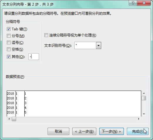 第 3 步 在"文本分列向导 - 第 2 步,共 3 步"对话框中选中"其他"复选框,在后面的文本框中输入分隔符号"-",单击"完成"按钮,如下图所示。
