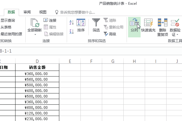 如下图所示的"产品销售统计表",在该表格中要将A列的销售日期数据分列为"销售年份""销售月份"和"销售日期"3列数据。