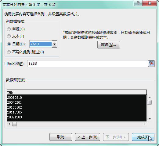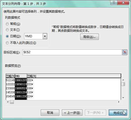 第 5 步 在"数据预览"区域选中第二列,选中 "日期"单选按钮,并设置好日期格式,在"目标区域"后的文本框中设置分列的出生日期放置的起始单元格为 E2,单击"完成"按钮,如下图所示。