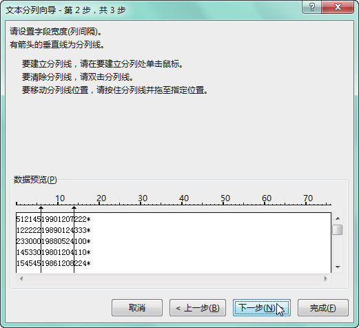 第 2 步 在"文本分列向导 - 第 2 步,共 3 步"对话框中的"数据预览"区域中依次单击第 6 位之后和倒数第 4 位之前的位置,建立分列线,如果单击的位置不准确,可将鼠标放置在分列线上拖动至合适的位置,单击"下一步"按钮,如下图所示。