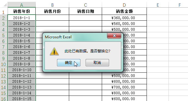 第 5 步 即可看到 A 列中的销售日期数据将以年份、月份和日期数据分列到了 A 列、B 列和 C 列对应的单元格中,如下图所示。