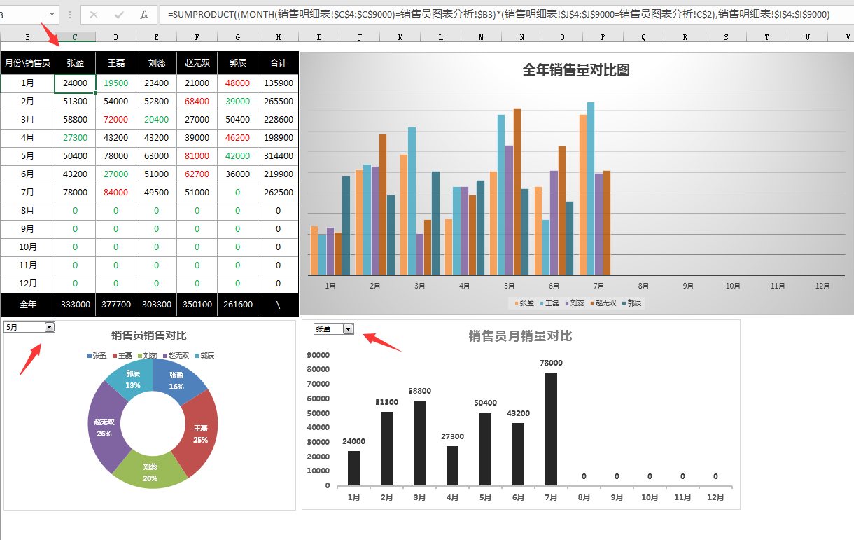 销售员图表分析为统计分析类表格,首次使用填写输入销售员的姓名即可,本系统可以自动标记每个月最低和最高的销售员。