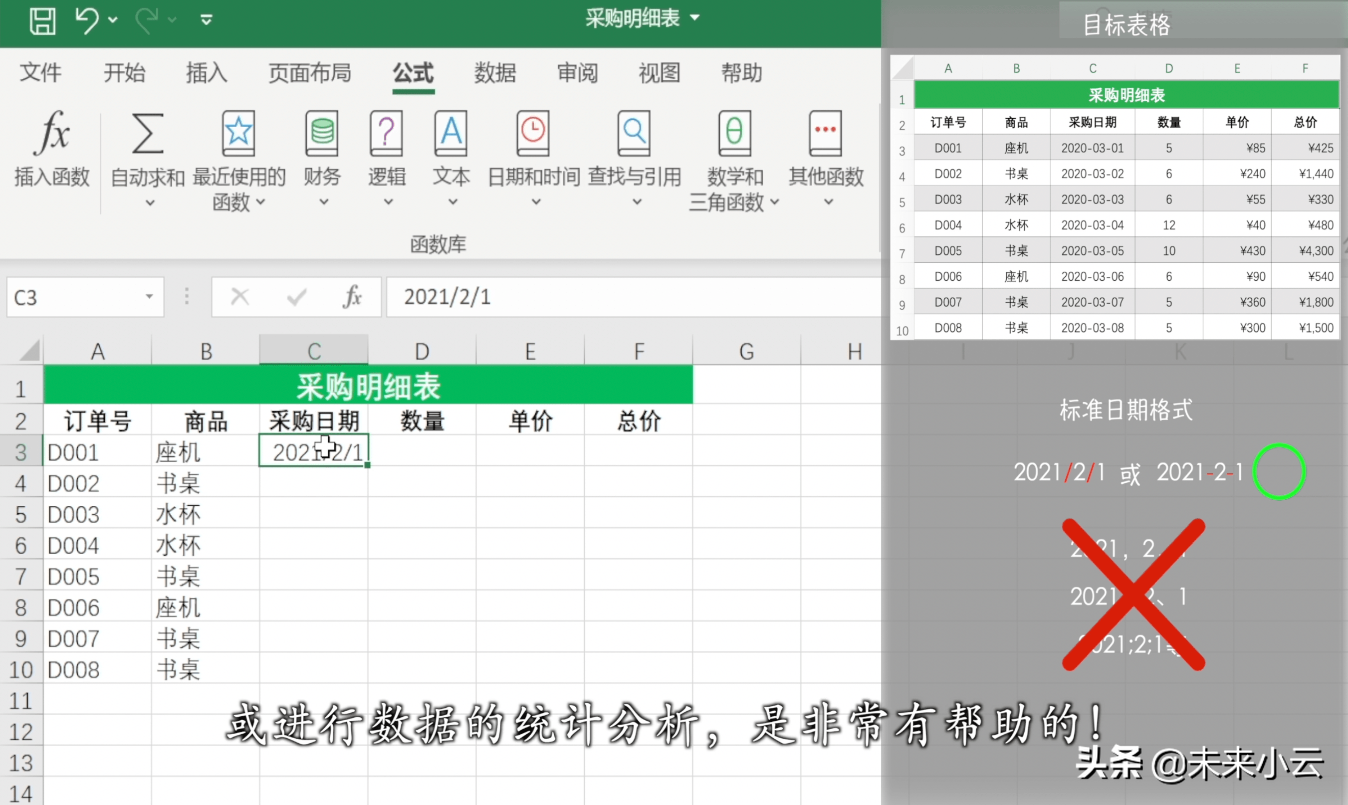 日期格式,年/月/日,这是我们习惯的日期顺序,标准的日期格式以单斜线:“/”,短横线:“-”,分开年月日。其他像逗号,顿号,冒号都是不标准的日期格式。大家一定要养成良好的习惯,这对于以后我们使用日期相关的公式或者函数来做统计分析,是有帮助的,会减少很多不必要的错误。值得一提的是,默认情况下,输入时以短横线分隔年月日,会自动转换成单斜线。