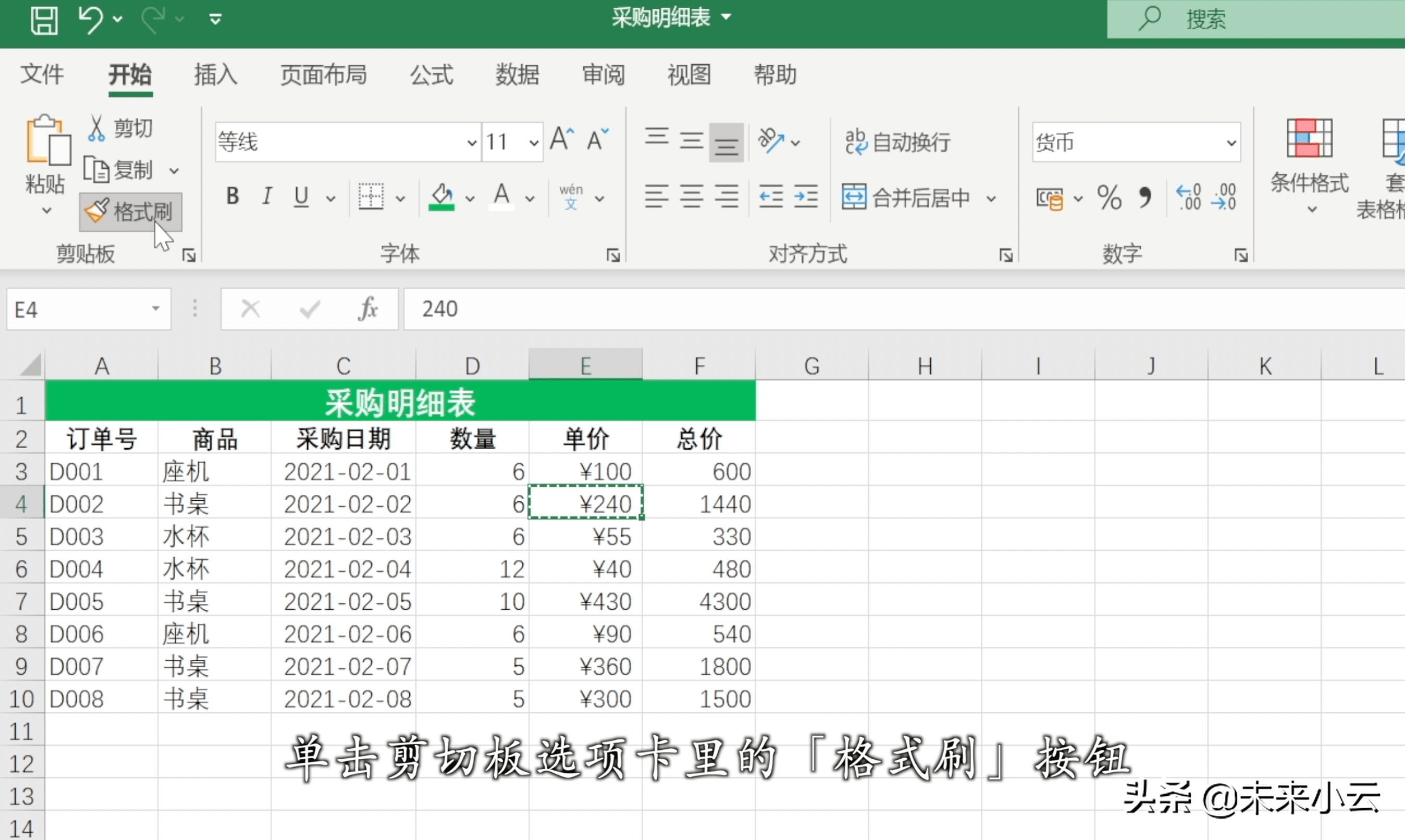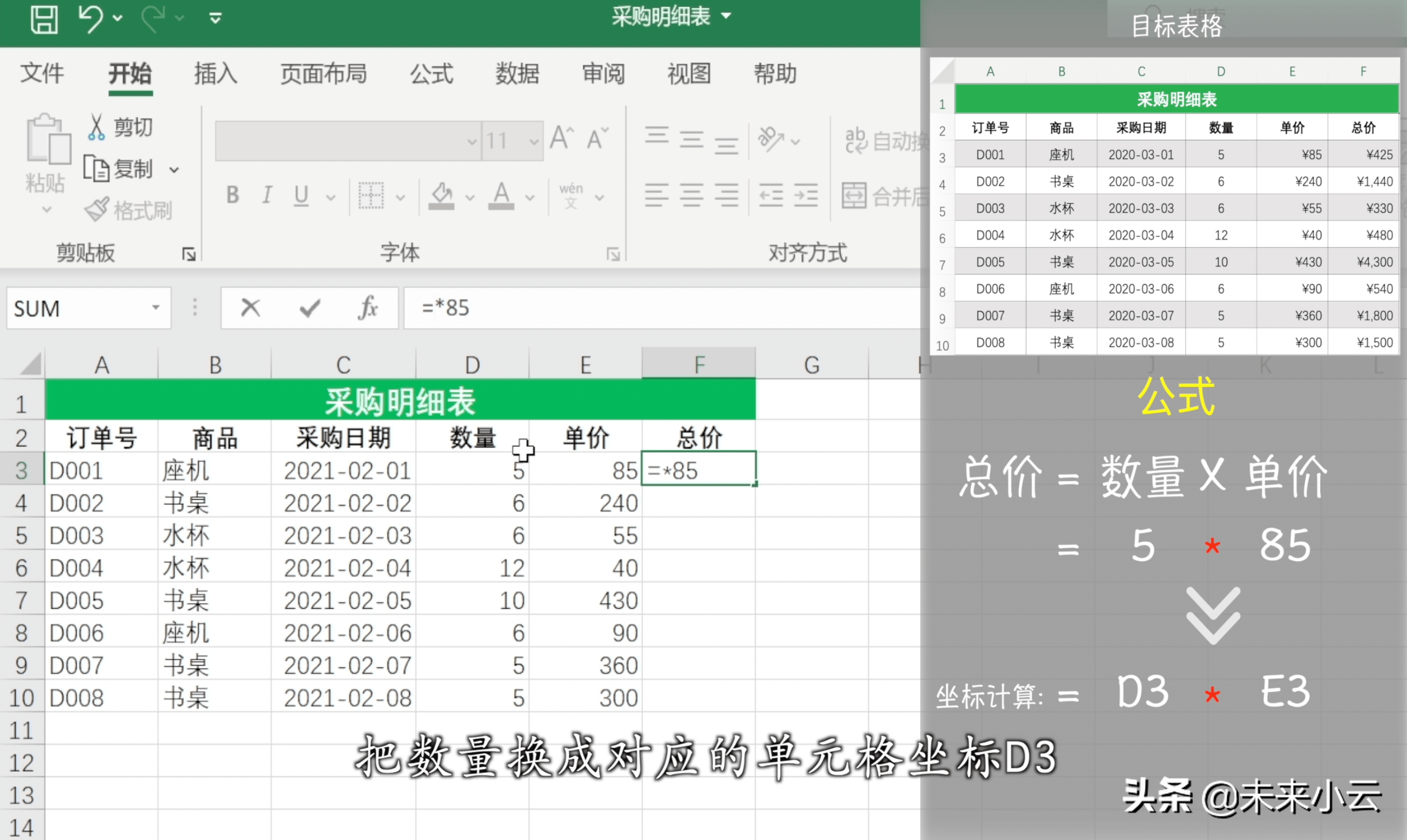 一般情况下,我们习惯直接用单元格内数据相乘,但是,如果有大量数据需要做计算,这种方式效率就太低了。所以,我们在做计算时,都以单元格坐标代替具体的数据内容。比如,单价是85对应的单元格坐标是E3,数量是5对应的单元格坐标是D3,所以,总价=E3*D3。